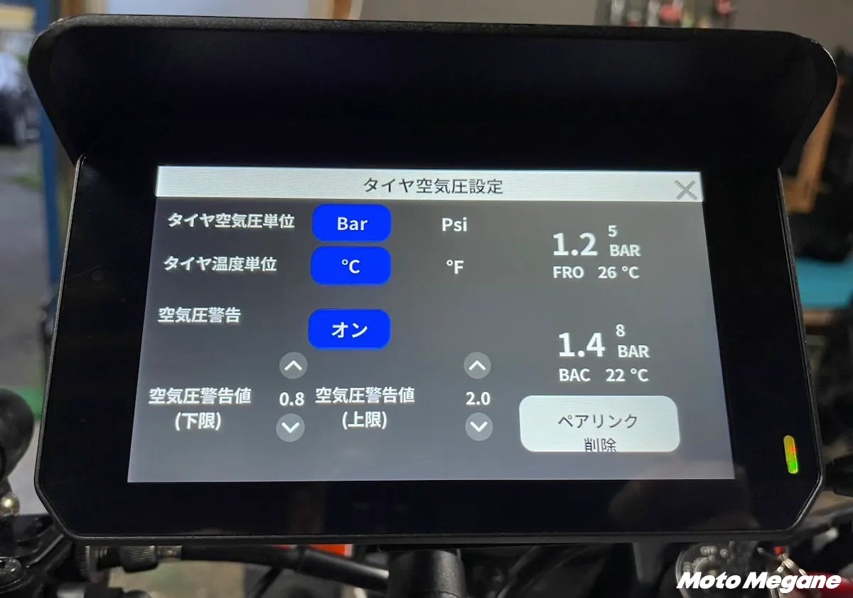 前後タイヤに付属のバルブにセンサーを装着するとリアルタイムの空気圧測定が可能。