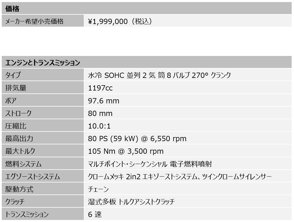 このエンジンは3500rpmという低回転域で105Nmのピークトルクを発揮し、最高出力は6550rpmで80PSに達します。