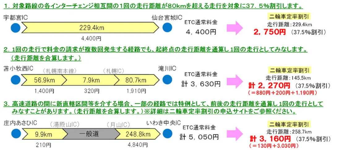 東日本高速道路株式会社、中日本高速道路株式会社、西日本高速道路株式会社(以下、「NEXCO三社」という。)及び宮城県道路公社は、令和7年4月5日(土)より、土日・祝日にNEXCO三社及び宮城県道路公社が管理する高速道路をご利用するETC二輪車を対象に、料金を定率で割り引く「二輪車定率割引」を実施します。